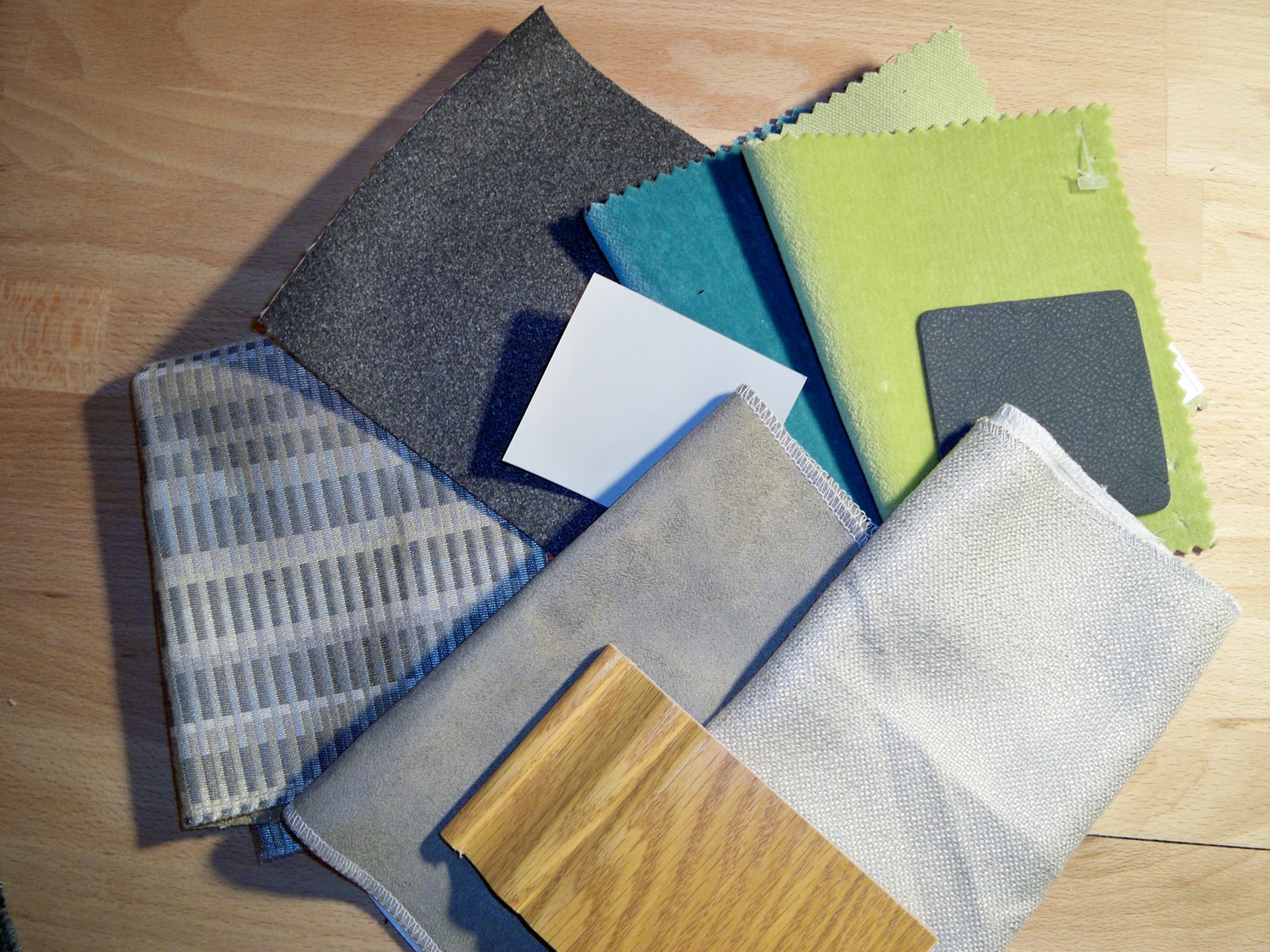 Option 2) A bit more bold. Black leather, soft charcoal, warm gray and the same vibrant shades of aqua and lime for a color splash! Paint Color: Benjamin Moore "Monroe Bisque." |